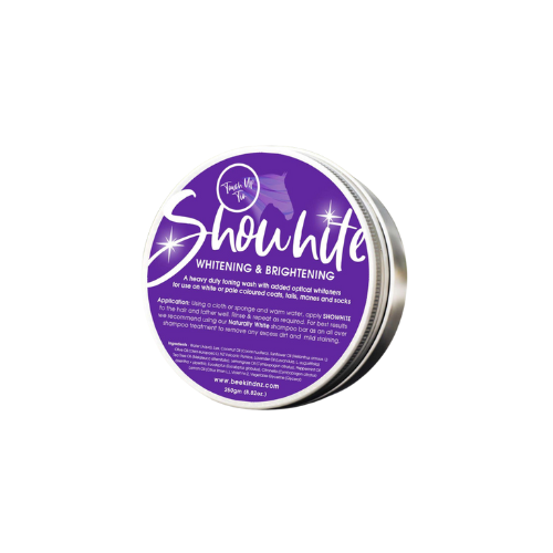 Introducing Bee Kind's new SHOWHITE Ultra Shampoo Toner! For dirty mare tails, stubborn sock stains, and grubby ponies! Concentrated with high quality cleansing ingredients, designed to strip dirt, urine, grease & other stubborn staining out. This formula is highly concentrated, so we suggest only using occasionally for those truly stubborn stains. Wash all over first with our famous Naturally White shampoo bar, you may not need to do any more! However, if some yellowing or staining still remains, use our SHOWHITE Shampoo toner in the bar or tin to remove.