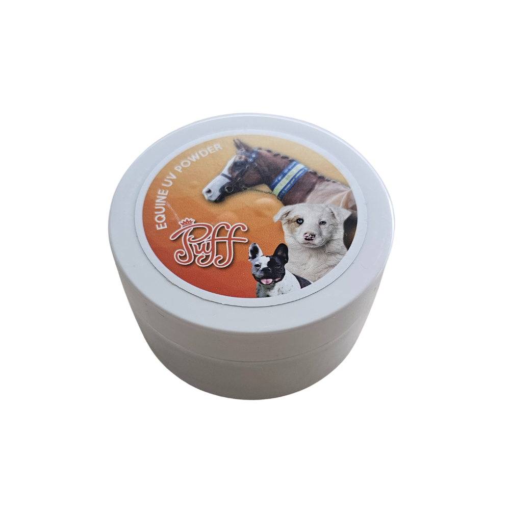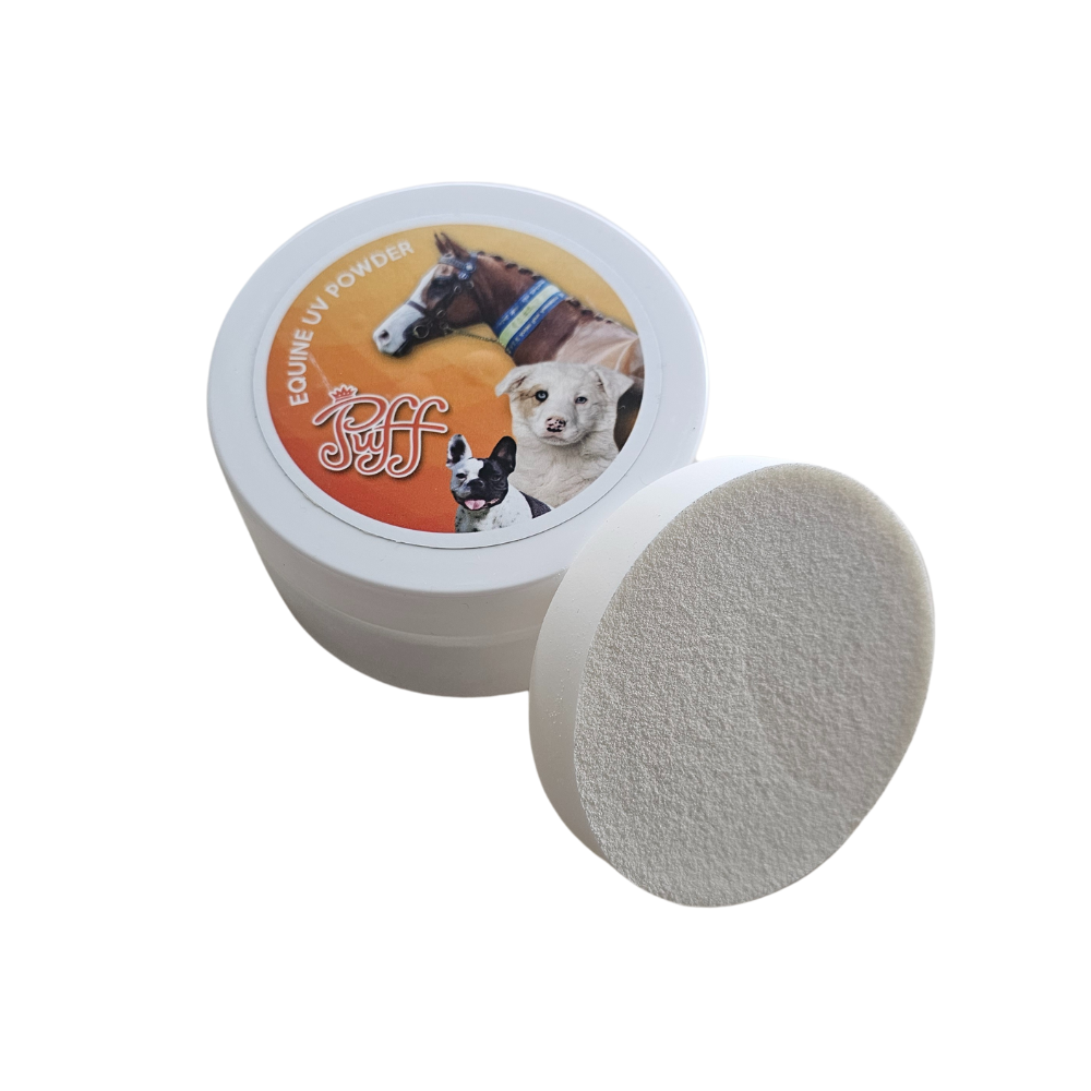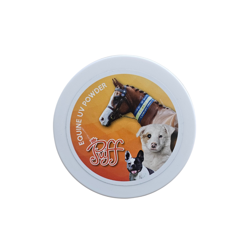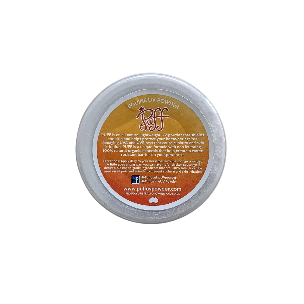 PUFF is a lightweight UV powder that shields the skin and helps prevent and protect your horse against UVA and UVB damaging rays that cause sunburn and skin irritation. PUFF is a unique formula with non-irritating organic minerals that help create a water resistant barrier.