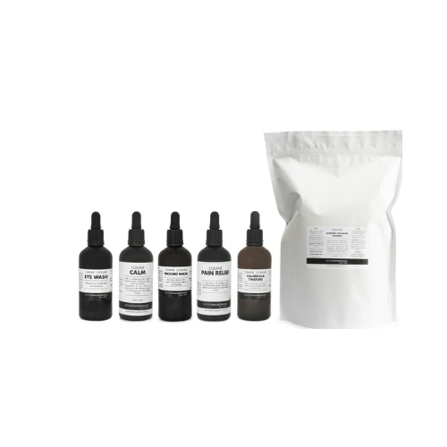 Packed in 100ml bottles our kit contains - Pain Relief, Eye Wash, Wound Wash, Calendula Tincture, Calm and Slippery Elm Bark Powder packed in a 250g bag.